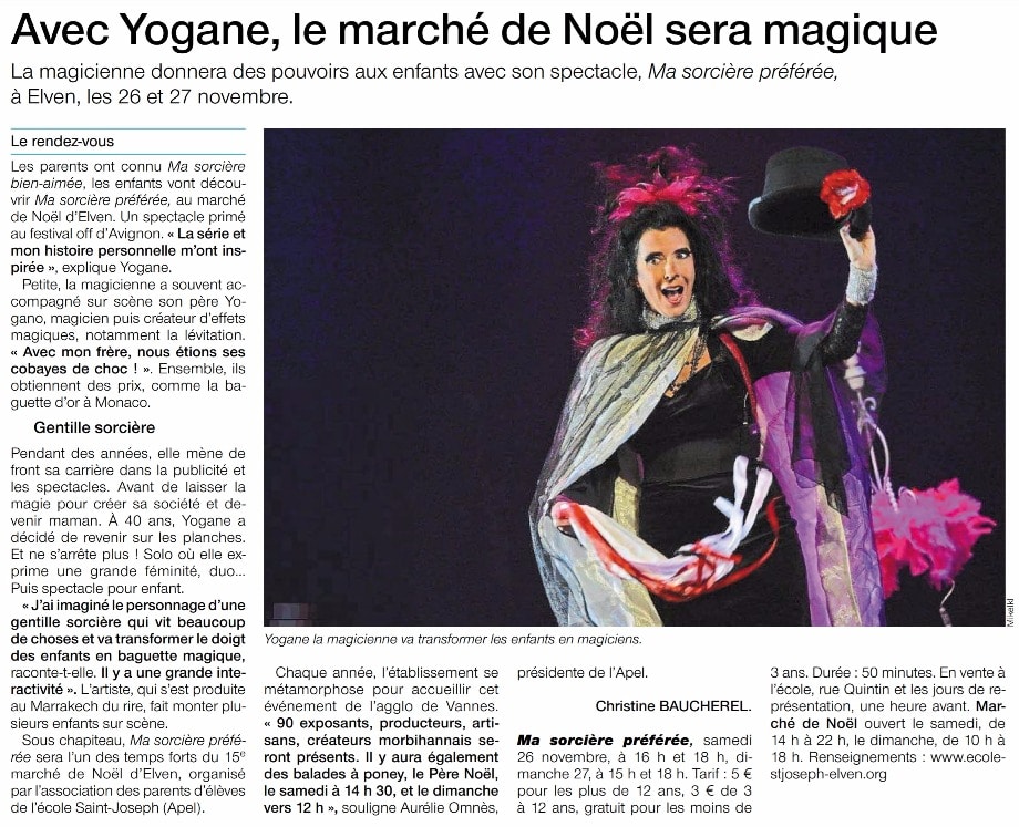 Actualités Yogane au 15ème Marché de Noël d’Elven (Bretagne) 01 Déc 2016 Spectacle de Magie Ma Sorcière Préférée : 2 articles dans Ouest France La magicienne Yogane a séduit 2 000 personnes au marché d'Elven Ouest France, le premier quotidien français en termes de… Thomas No Comments